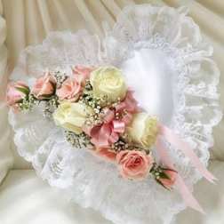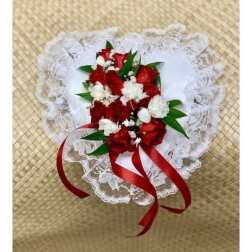 Price: $110.00SATIN HEART PILLOW WITH RED AND WHITE FLOWERS